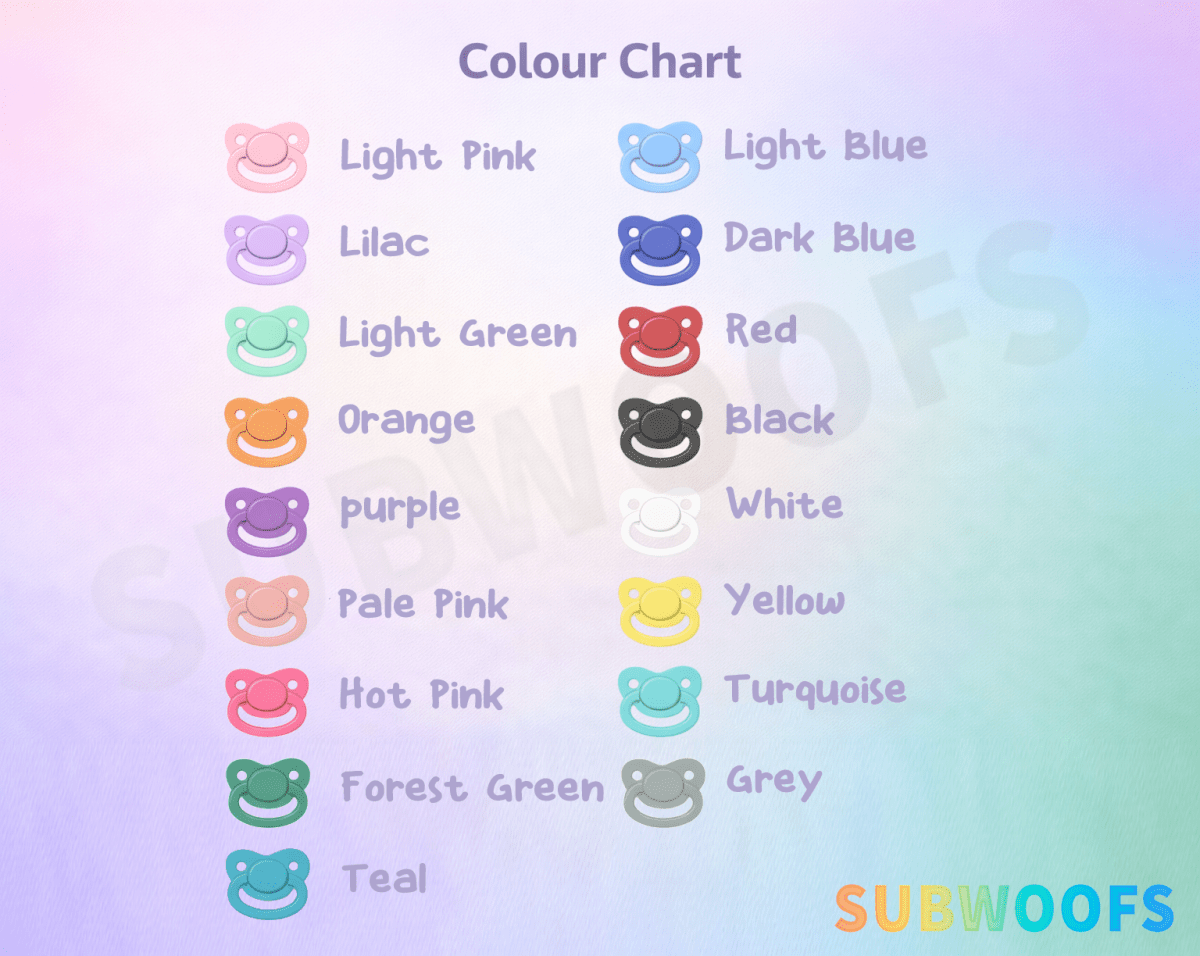 Adult Pacifiers with a choice of colours and teats.