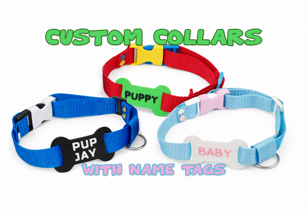 These are cute adult sized pet-play kink collars with custom name tags.
